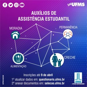 Estão abertas até 9 de abril as inscrições para os auxílios Permanência, Moradia, Alimentação e Creche. As ações são voltadas a estudantes de graduação presencial com renda familiar per capita de até um salário mínimo e meio vigente.
