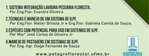 Foram convidados quatro palestrantes da área que tratarão dos seguintes temas: Sistema de Integração Lavoura Pecuária Floresta; Técnicas e manejo de um sistema de ILPF; Espécies com potencial para uso em sistemas de ILPF; Manejo de pastagens em sistemas de ILPF.