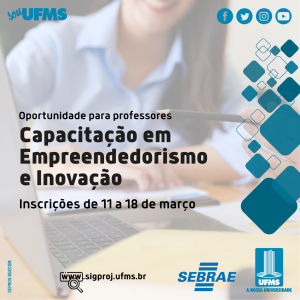 Entre 11 e 18 de março, professores da UFMS podem se inscrever no processo seletivo para preenchimento de vagas em turmas de capacitação na metodologia da disciplina de Empreendedorismo e Inovação. A ação foi possível por meio de parceria entre a UFMS, por meio da Agência de Internacionalização e Inovação (Aginova) e da Pró-reitoria de Gestão de Pessoas (Progep), e o Serviço de Apoio às Micro e Pequenas Empresas de Mato Grosso do Sul (Sebrae/MS).